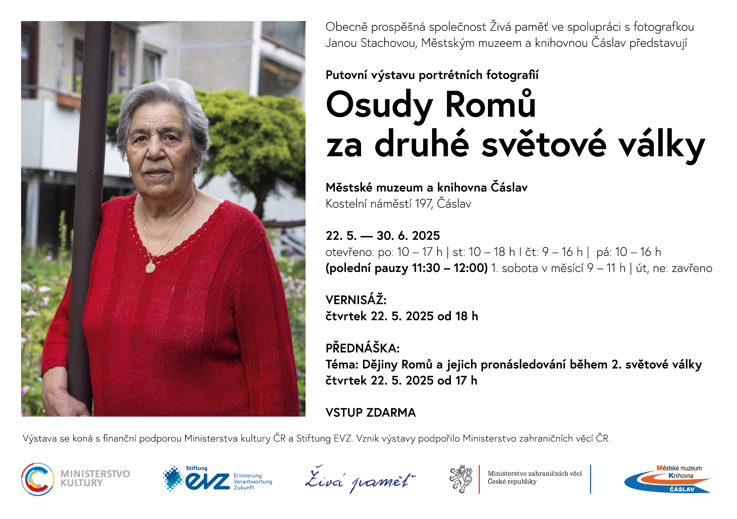 V Městském muzeu a knihovně Čáslav (Kostelní náměstí 197) byla ve čtvrtek 22. května 2025 v 18:00 hodin slavnostně zahájena výstava portrétních fotografií „Osudy Romů za druhé světové války“. Výstava zachycuje silné životní příběhy romských přeživších, kteří během 2. světové války čelili rasovému pronásledování.